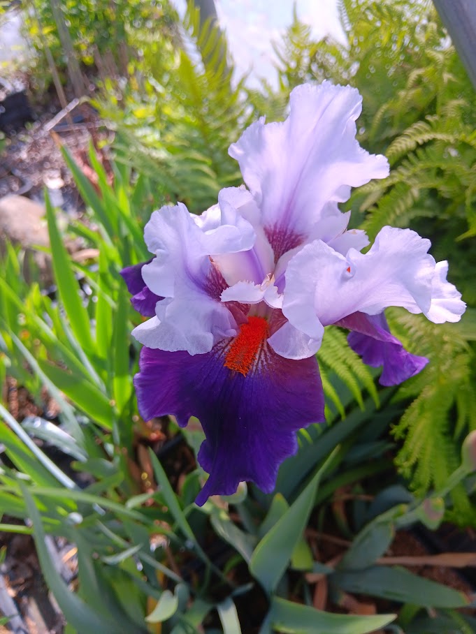 Hohe Bartiris mit hellblauem Dom und dunkelblauen Hängeblättern und ornagerotem Bart